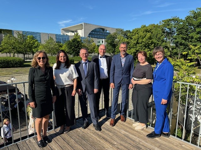 Unter ihnen auch fünf Prüferinnen und Prüfer aus Ostwestfalen. Sie alle stehen für langjährige Erfahrung in der beruflichen Aus- und Weiterbildung. Gemeinsam mit IHK-Hauptgeschäftsführerin, Petra Pigerl-Radtke, und IHK-Geschäftsführerin Berufliche Bildung, Ute Horstkötter-Starke, drückte die kleine Delegation aus der Heimat dem Team von COBUS ConCept in der Hauptstadt fest die Daumen.