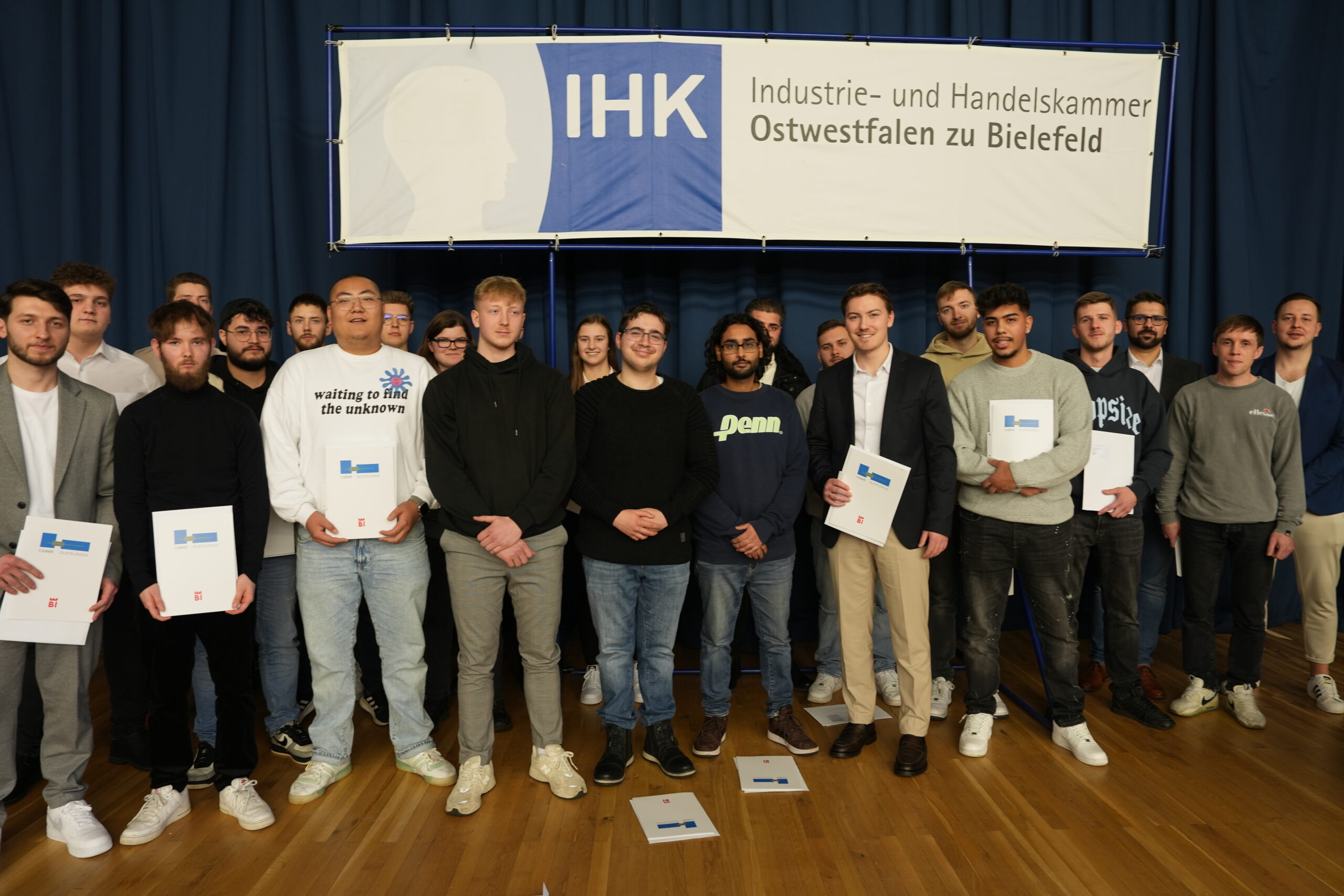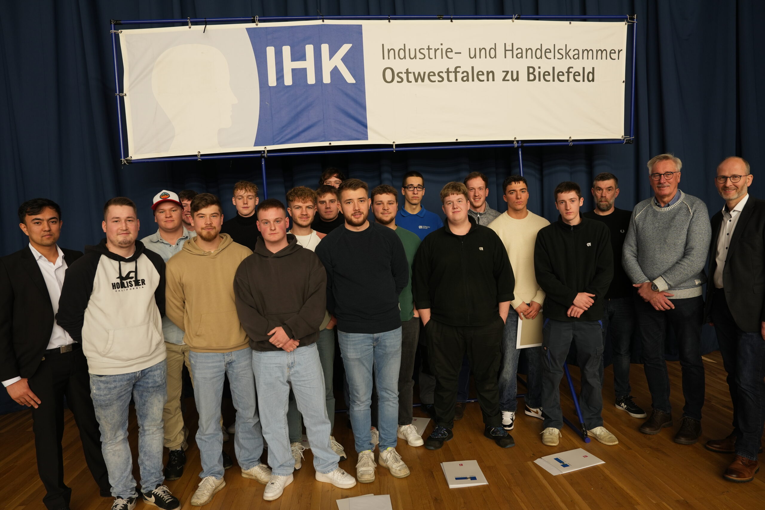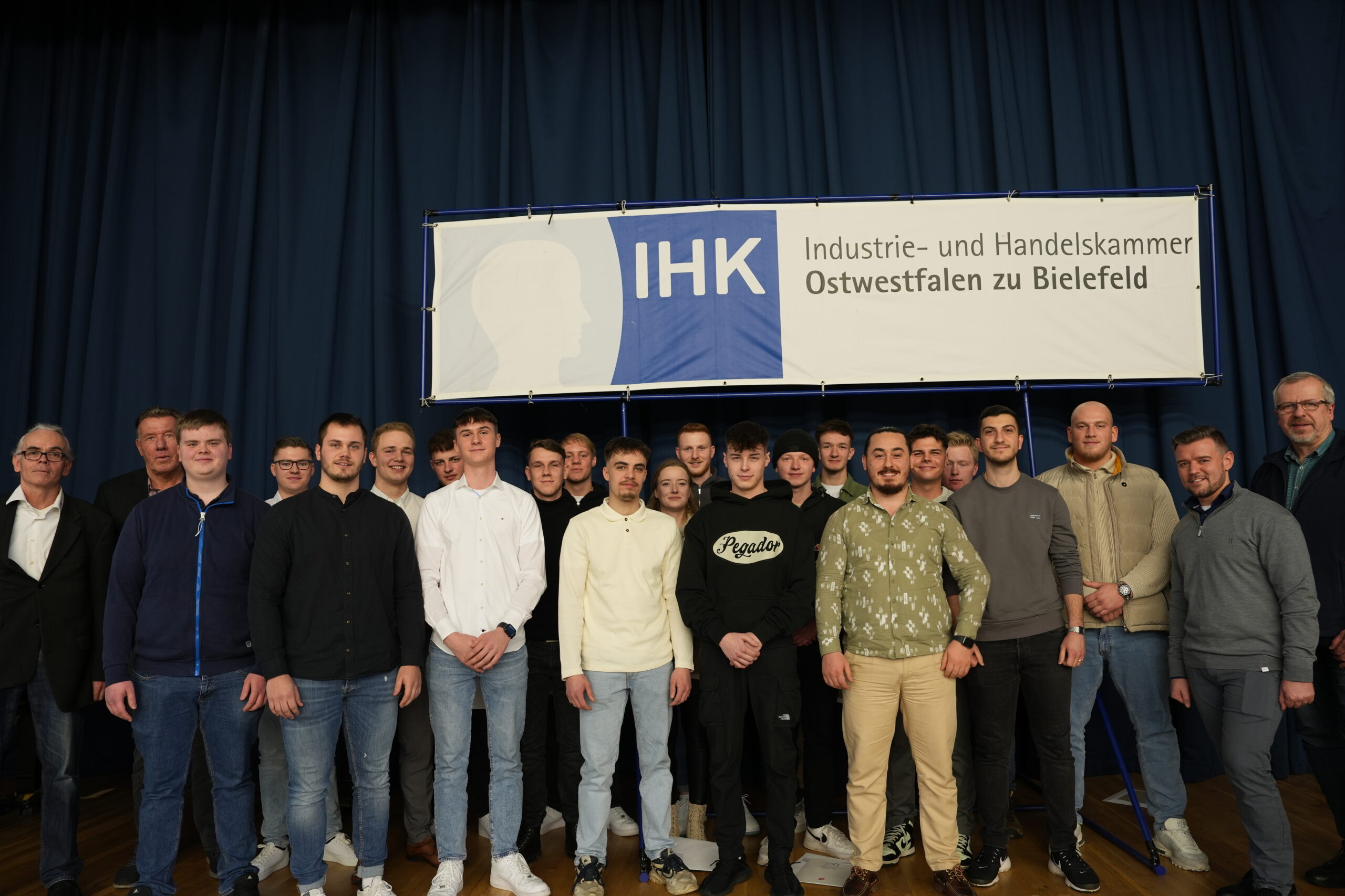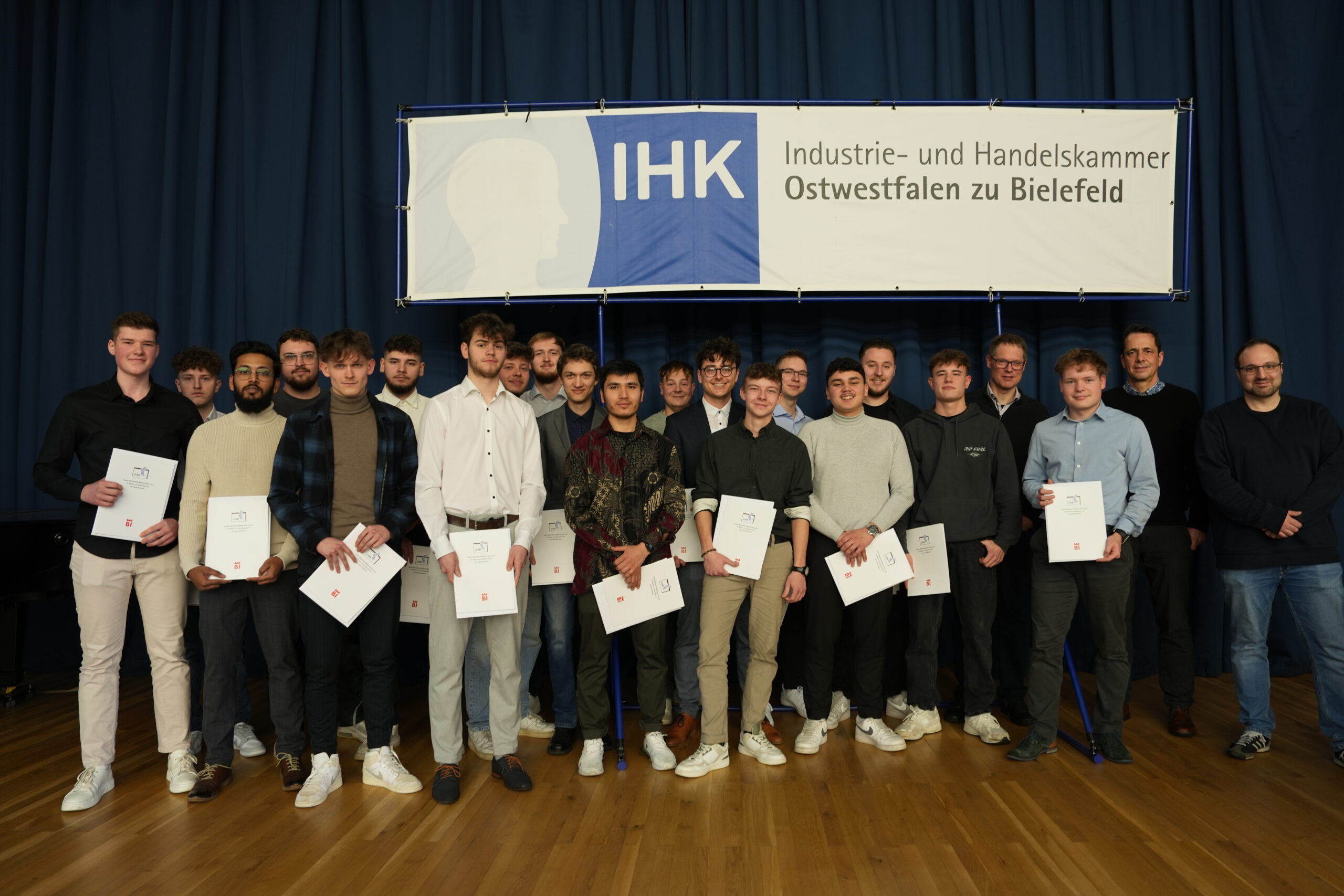 IHK-Facharbeiterverabschiedung: Die Industrie- und Handelskammer Ostwestfalen zu Bielefeld (IHK) verabschiedete 126 Absolventinnen und Absolventen der Winterprüfungen 23/24 in folgenden Fachgebieten: Industriemechanik, Zerspanungsmechanik, Werkzeugmechanik, Konstruktionsmechanik, Elektronik für Betriebstechnik sowie Mechatronik.